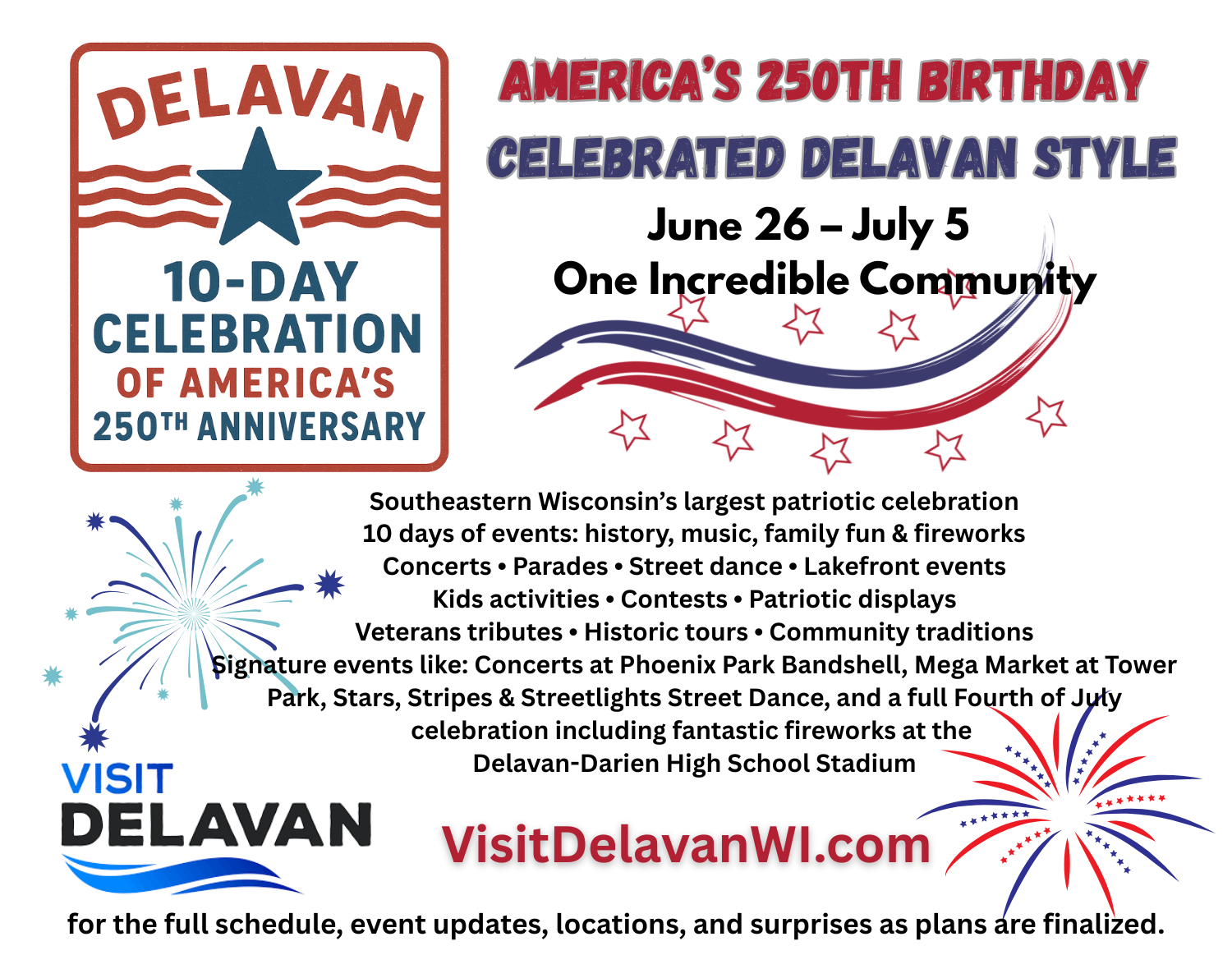 DELAVAN, WI – The City of Delavan is proud to announce an unprecedented 10-day celebration honoring America’s 250th birthday, running from Friday, June 26 through Sunday, July 5, 2026. In collaboration with Visit Delavan, Delavan-Darien School District, local civic groups, area businesses, and enthusiastic city residents, Delavan will transform the traditional single-day Fourth of July observance into an extended festival of patriotism, community connection, and family entertainment.